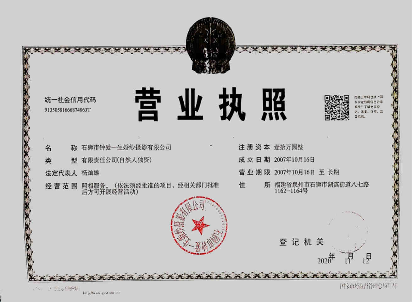 • 公示单位:石狮市钟爱一生婚纱摄影有限公司