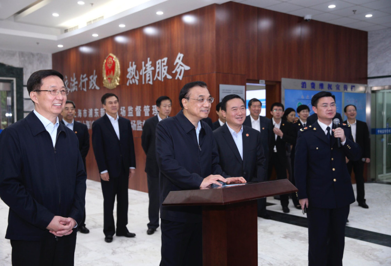 李克强来到浦东新区市场监管局,听取实施工商、质量、食品药品和价格等“四合一”综合执法监管的情况介绍,详细了解对各部门行政审批开展网上督查的制度设计和实施效果,对他们不断创新事中事后监管体制和督查方式、促进提高政府行政效率表示赞许。李克强还通过“双随机一公开”系统现场下达了食品安全抽查指令,对如何随机抽取检查对象和检查人员进行了检验。他说,改革不是简单的监管职能合并,而是强化净化市场的功能,催生市场活力。这既靠人,更靠体制的力量。