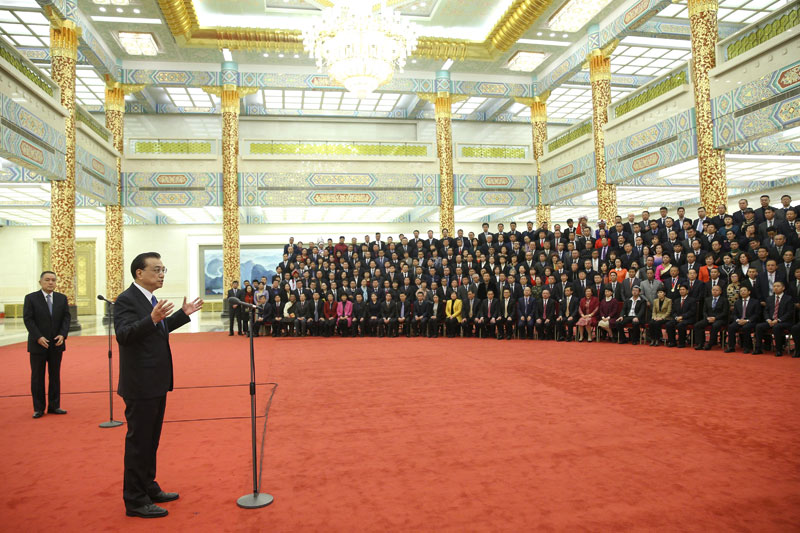 12月5日,中共中央政治局常委、国务院总理李克强在北京会见全国先进个体工商户代表,与他们合影留念并作重要讲话。
