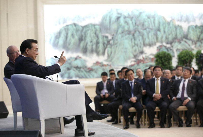 2016年6月28日上午,国务院总理李克强在天津梅江会展中心同出席2016年夏季达沃斯论坛的300多名各国企业家代表举行对话会。(资料图)