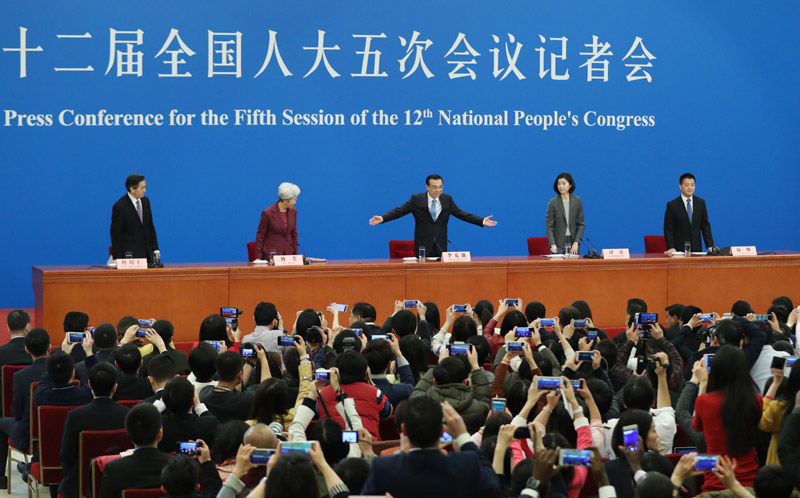 3月15日上午十二届全国人大五次会议闭幕后,国务院总理李克强在人民大会堂三楼金色大厅会见采访十二届全国人大五次会议的中外记者并回答记者提出的问题。