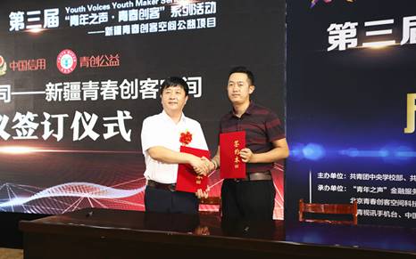 “青年之声”金融服务联盟副秘书长丁雷,新疆大学党委学生工作部副部长孙琳杰,青春创客空间创始人杨政链,新疆青春创客空间负责人、新疆青年信信用评价有限公司董事长徐洪波,乌鲁木齐水磨沟区人社局就业中心副主任戚伟,中国玉文化研究会副会长李常宝共同启动新疆青春创客空间公益项目。