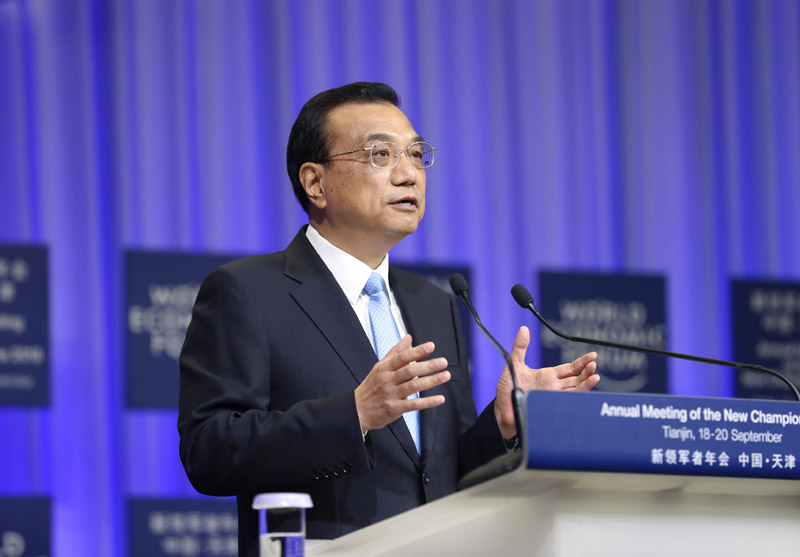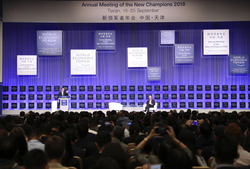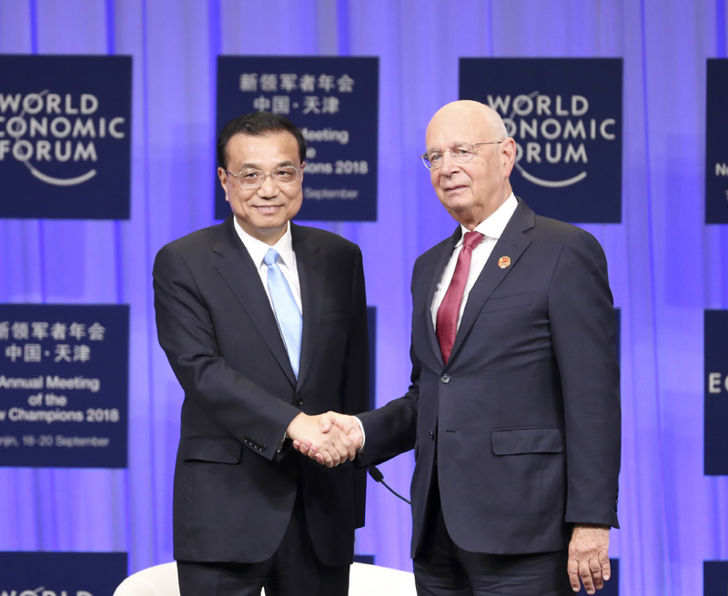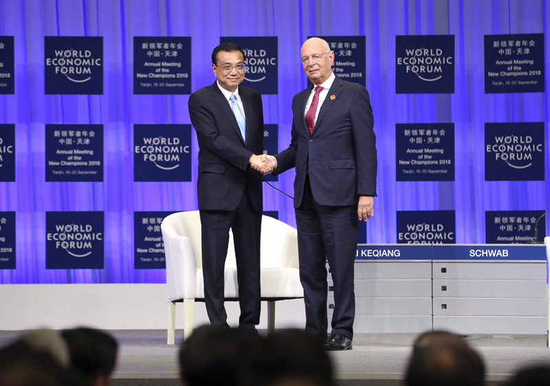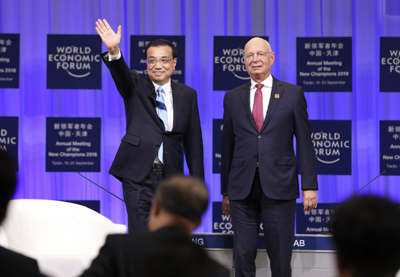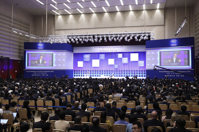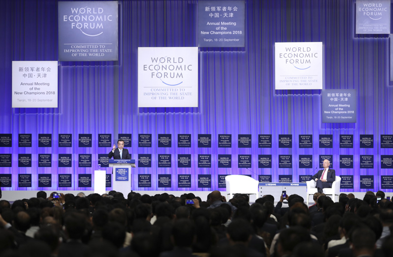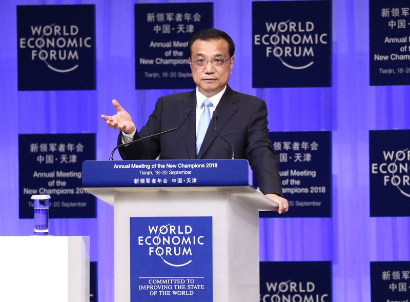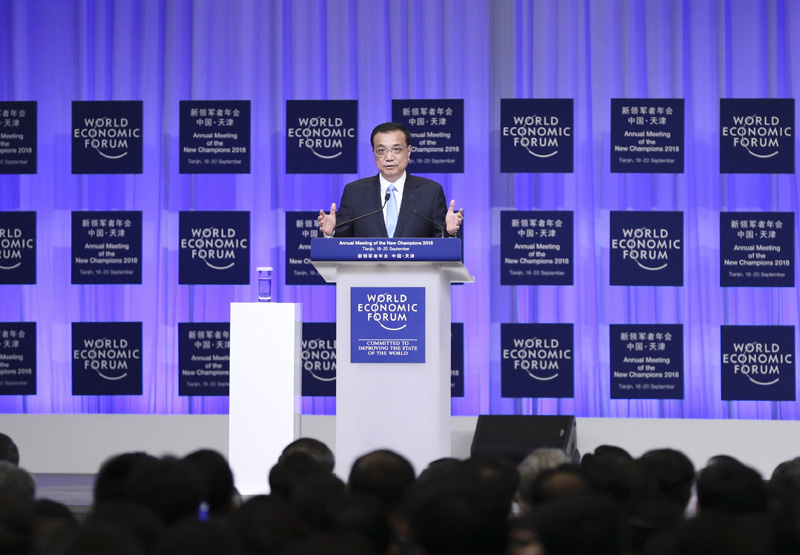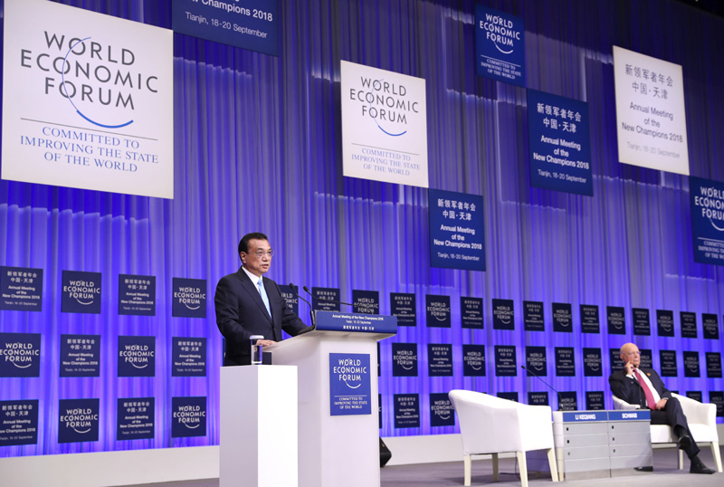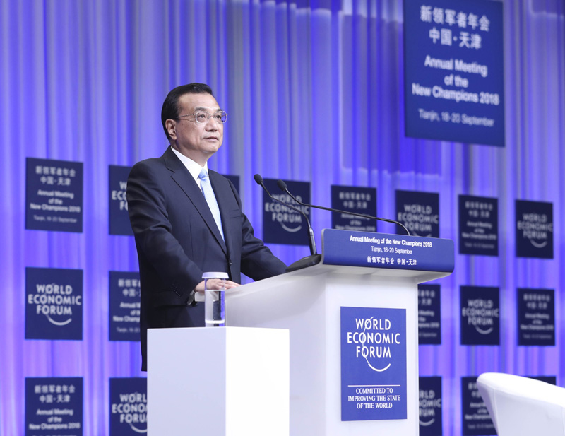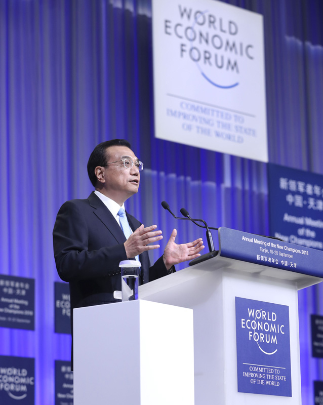 9月19日上午,国务院总理李克强在天津梅江会展中心出席2018年夏季达沃斯论坛开幕式并发表特别致辞。
