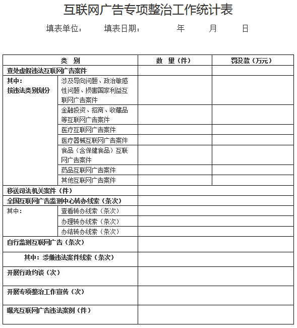 专项整治工作中,各级工商和市场监管部门遇有重大案件和重要情况要及时、逐级上报。各省(区、市)工商和市场监管部门在每月30日前报送互联网广告典型案例和《互联网广告专项整治工作统计表》(详见附件),并于12月10日前将专项整治工作总结上报工商总局广告司。