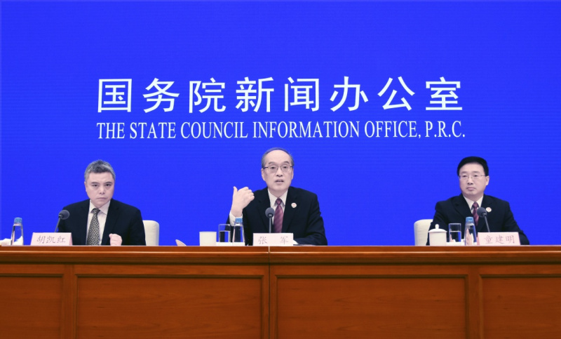 2019年1月3日,国务院新闻办公室在北京举行新闻发布会,请最高人民检察院检察长、首席大检察官张军(中),最高人民检察院副检察长、二级大检察官童建明(右)介绍最高人民检察院改革内设机构,全面履行法律监督职能有关情况,并答记者问。