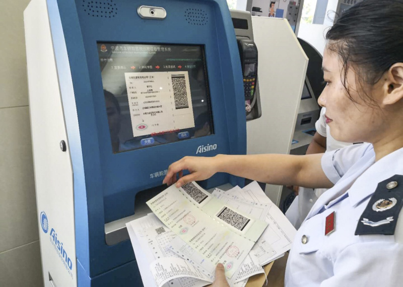 工作人员在浙江余姚市公安局交通警察大队车辆管理所操作车辆购置税远程征收管理系统(2018年6月27日摄)。