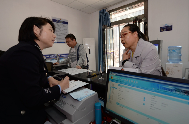 西安市公安局高新分局高新路派出所户籍民警李国琰(左)为群众办理落户手续(2018年3月29日摄)。