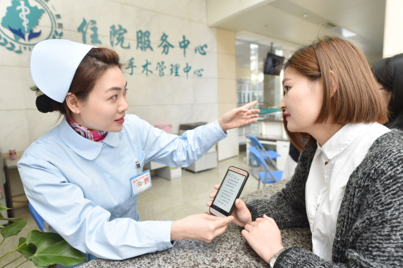在福建医科大学附属第一医院,护士引导患者凭出院结算短信直接到住院收费处领取发票和余款,大大简化出院手续,实现医保结算“零等待”(2018年3月22日摄)。