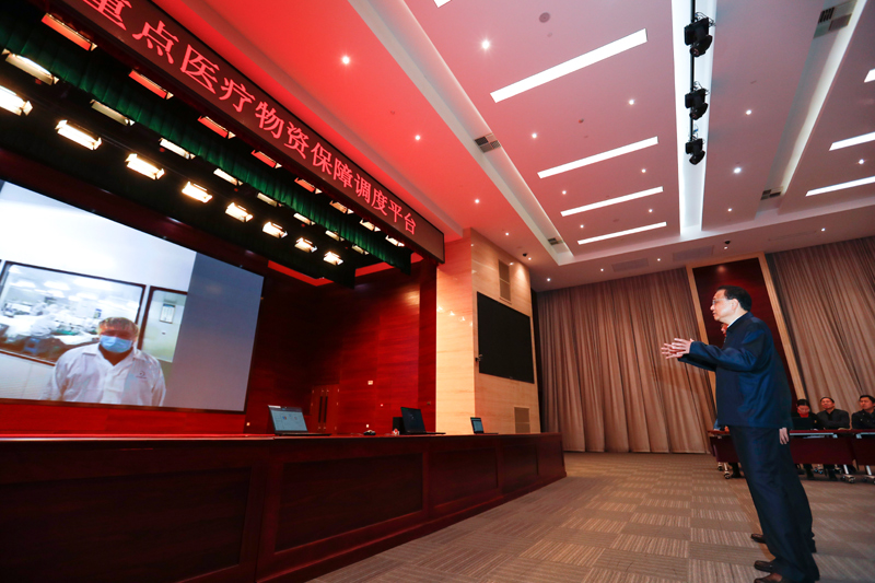 2月1日,中共中央政治局常委、国务院总理、中央应对新型冠状病毒感染肺炎疫情工作领导小组组长李克强赴疫情防控国家重点医疗物资保障调度平台考察。这是李克强与生产企业视频连线。