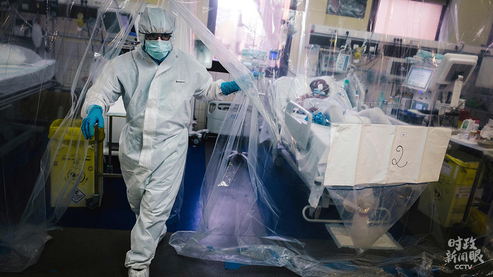 △2020年4月,法国巴黎,一名医务人员在医院的重症监护室护理一名新冠肺炎患者后走出用塑料布隔开的房间。