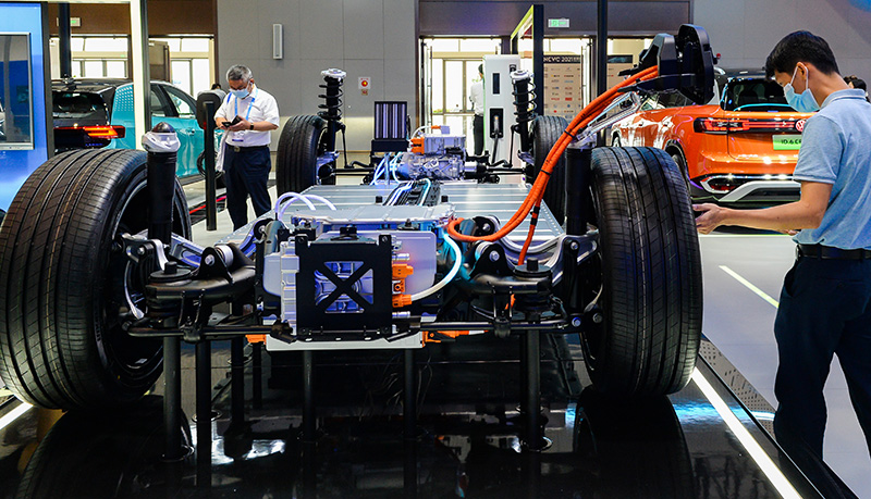 9月15日,一名观众在参观大众汽车模块化电驱动平台。